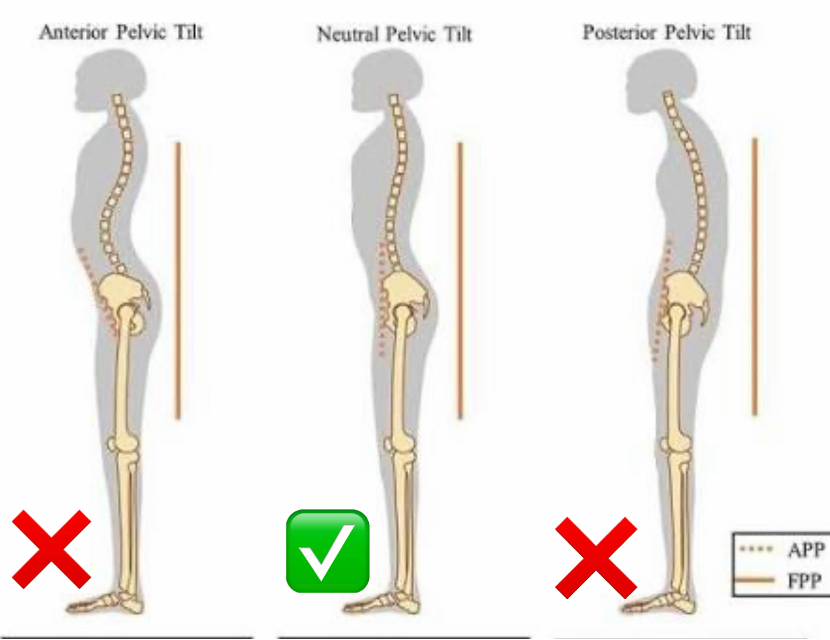 الحوض يكون مستويًا، لا يميل للأمام أو الخلف بشكل مفرط بحيث يسمح للعمود الفقري بالحفاظ على الانحناءات الطبيعية. هذه الوضعية تحمي أسفل الظهر من الضغط تحسن الثبات والتحكم وتفعل عضلات الكور العميقة بشكل صحيح