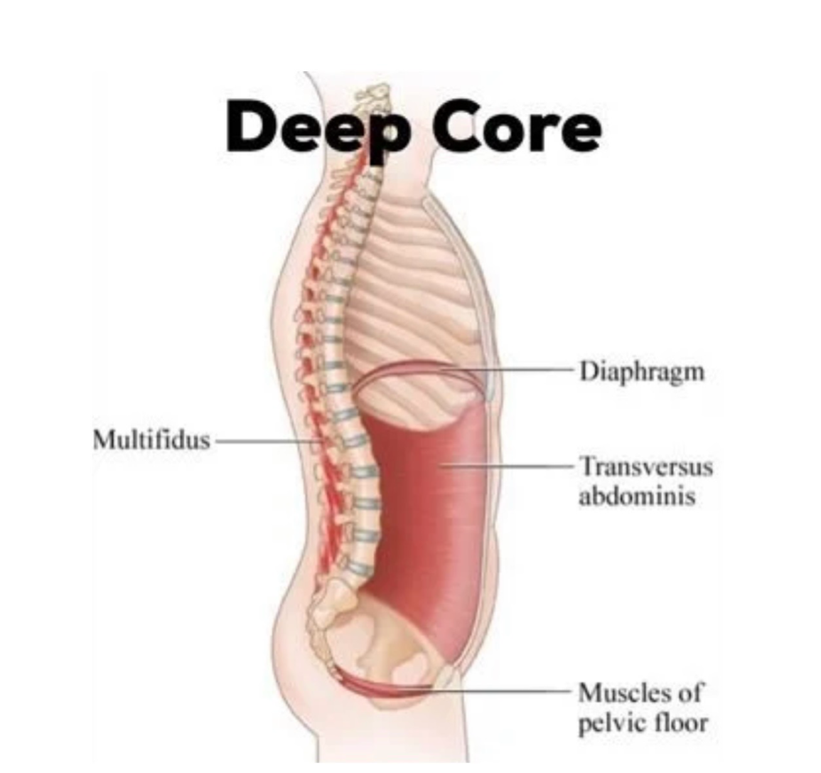 Transverse Abdominis (عضلات البطن العميقة) Pelvic Floor (عضلات قاع الحوض) Multifidus (عضلات صغيرة تدعم العمود الفقري) Diaphragm (الحجاب الحاجز) من اجل تفعيل العضلات عند الزفير نقوم بسحب عضلات الحوض للاعلى وسحب عضلات البطن للداخل والاعلى. عند تفعيل هذه العضلات نحن نقوم بتثبيت العمود الفقري والحوض أثناء الحركة وحماية أسفل الظهر من الضغط والإصابات وزيادة القوة والتحكم خلال التمرين